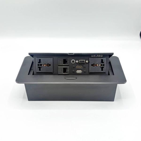 پنل M.PRO مدل VSP VS08 یک پنل فول پورت توکار است که روی میز نصب می‌شود. این پریز توکار از برند M.PRO بوده و به‌صورت لپ‌تاپی باز و بسته می‌شود؛ به‌طوری‌که در حالت بسته، سطح آن کاملاً هم‌تراز و یکدست با میز خواهد بود. این پنل مجهز به پورت‌های HDMI، دو عدد POWER، دو عدد LAN، AUX، USB و VGA است که نیازهای مختلف کاربران را پوشش می‌دهد.